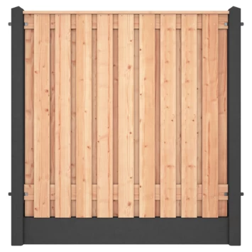 Voor het tuinscherm kun je kiezen tussen twee soorten materialen: geïmpregneerd grenenhout of douglashout. Iedere schutting staat uit 19 planken en dankzij de dichte opbouw, zorgt het scherm voor zowel veel privacy als een hoge windbelastbaarheid. Zoals op de afbeelding te zien is, wordt het scherm verticaal geplaatst. Bij een aanschaf vanaf 5 meter aan houtbetonschutting, kan er ook een extra element toegevoegd worden zoals een gaasscherm, een hoog- of laag scherm en een schuin aflopend scherm.