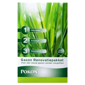 Dit Pokon Gazon renovatiepakket bevat alles wat u nodig hebt om uw gazon te renoveren, zonder omspitten. Dit handige 3-in-1 pakket bevat middel tegen mos, gazonmest en graszaad. Kale plekken die zijn ontstaan na de winter kunt u hiermee eenvoudig herstellen. Dankzij de gazonmest geeft u de grond een goede basis, het antimosmiddel weert het mos en het graszaad vult de kale plekken op/ Eén verpakking Pokon Gazon Renovatiepakket van 1750 gram is voldoende voor het herstellen van 25m2 gazon. Zo herstelt u uw siergazon, speelgazon en/of schaduwgazon in zonder dat omspitten nodig is.