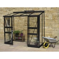 De Broadway 84, zwart gecoat is een muurkas met een optimaal gebruiksgemak, eigentijdse vormgeving en heeft een elegante uitstraling. Dit muurmodel stelt als enige voorwaarde een beschikbare en stevige muur. De dubbele drempelloze schuifdeur met slot bevindt zich, in tegenstelling tot veel andere muurkassen, op de lengtezijde van de kas. De Broadway biedt wordt geleverd in 3 mm dik veiligheidsglas (lange ruiten). Het veiligheidsglas gefixeerd met kunststof beglazingsstrips. Een goede beluchting is van levensbelang in de kas. Daarom is de Broadway voorzien van 1 dakraam. Voor optimaal gebruiksgemak wordt het gebruik van een automatische raamopener geadviseerd. Deze raamopeners zijn temperatuurgevoelig en openen of sluiten het dakraam automatisch. Voor een stabiele en sterke basis is een funderingsrand noodzakelijk. De Broadway muurkas wordt standaard (gratis) geleverd met een aluminium funderingsrand van 8 cm hoog.